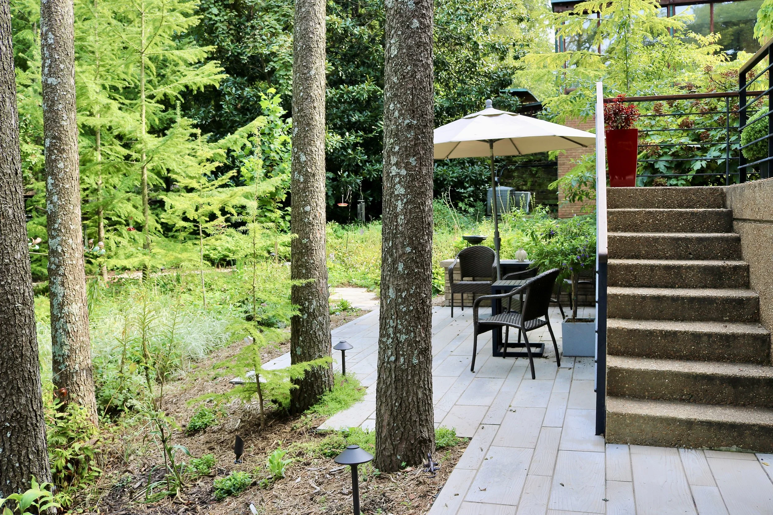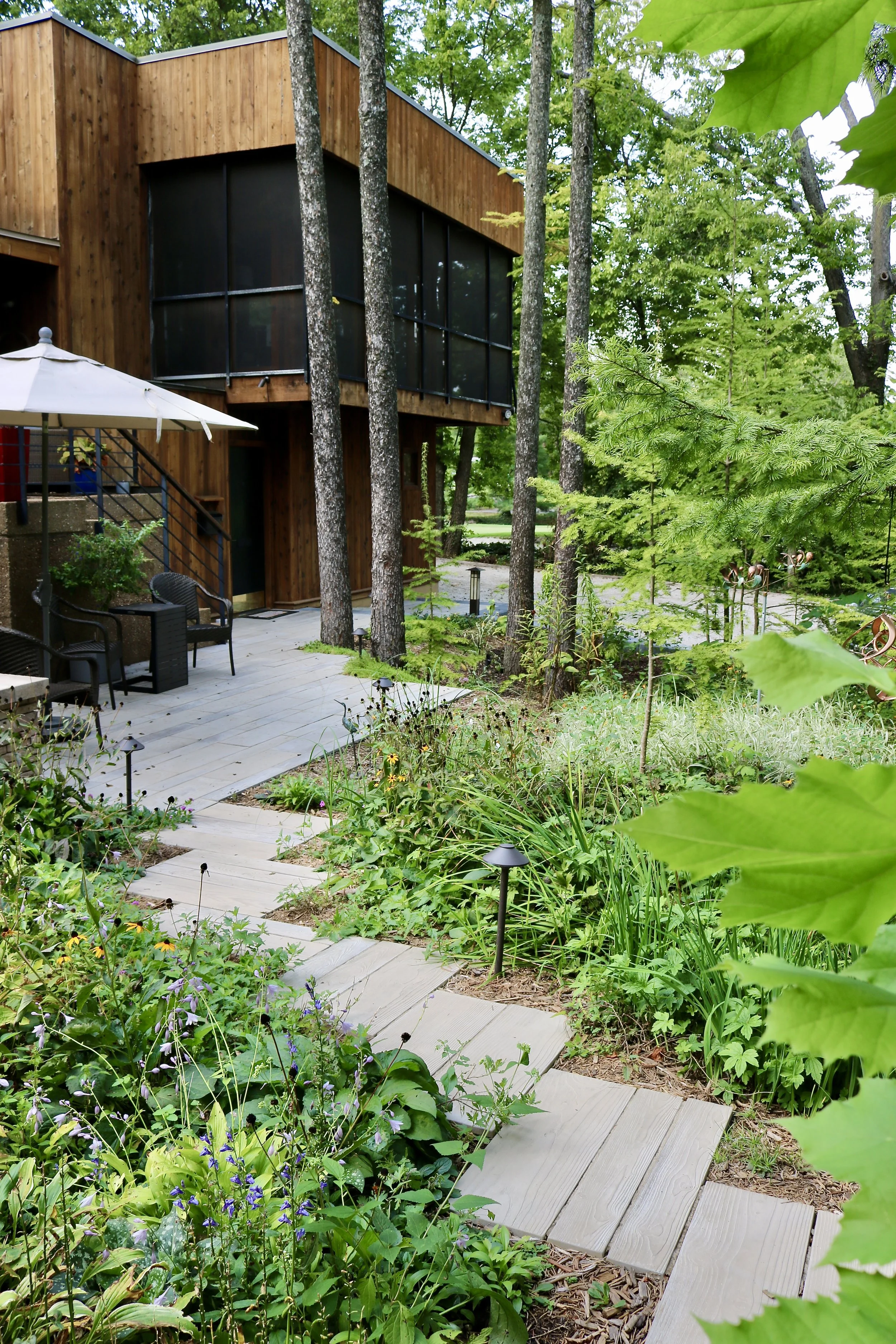 Permeable pavers, rain gardens, and traditional drainage solutions all work together in a landscape that is as functional as it is beautiful.